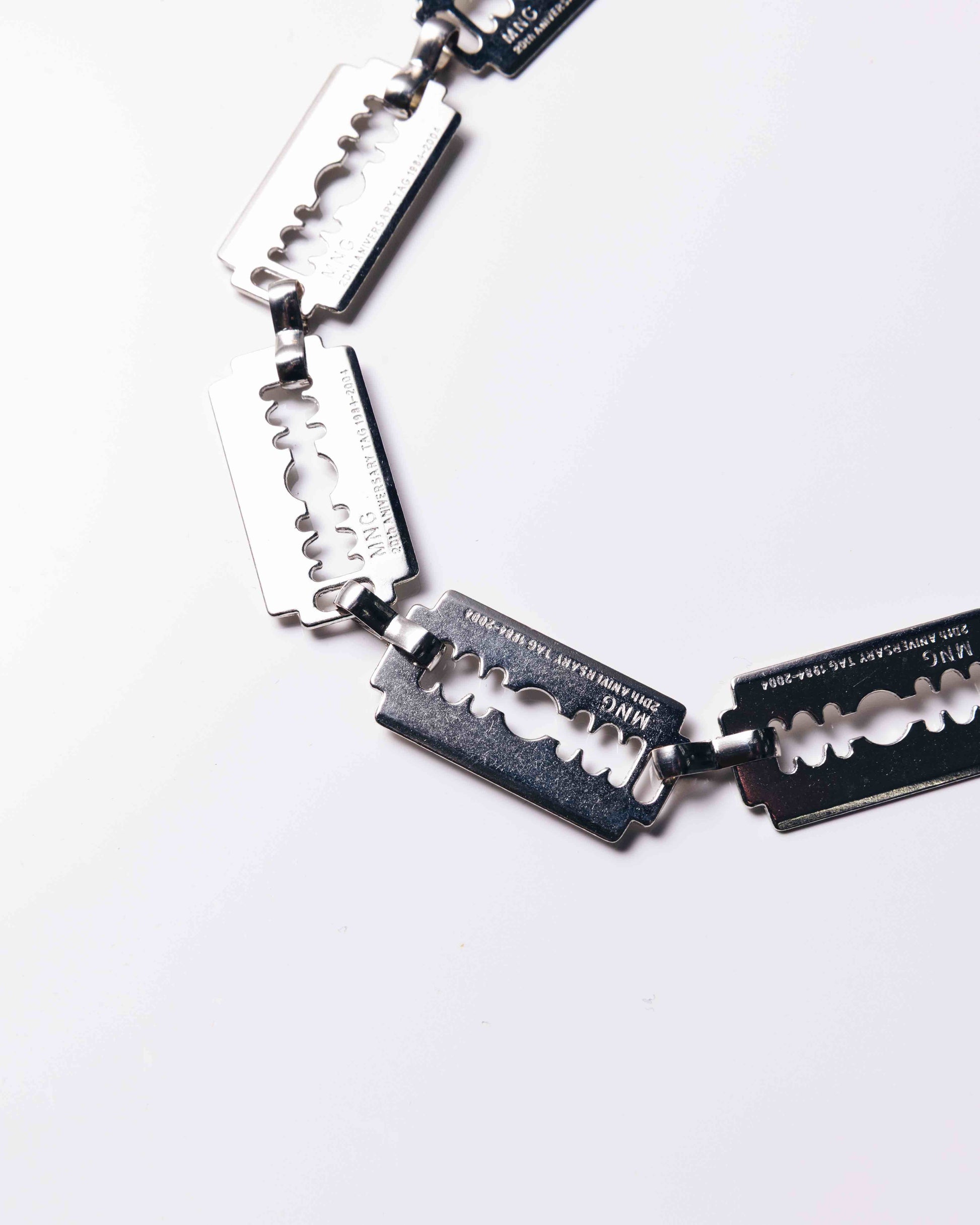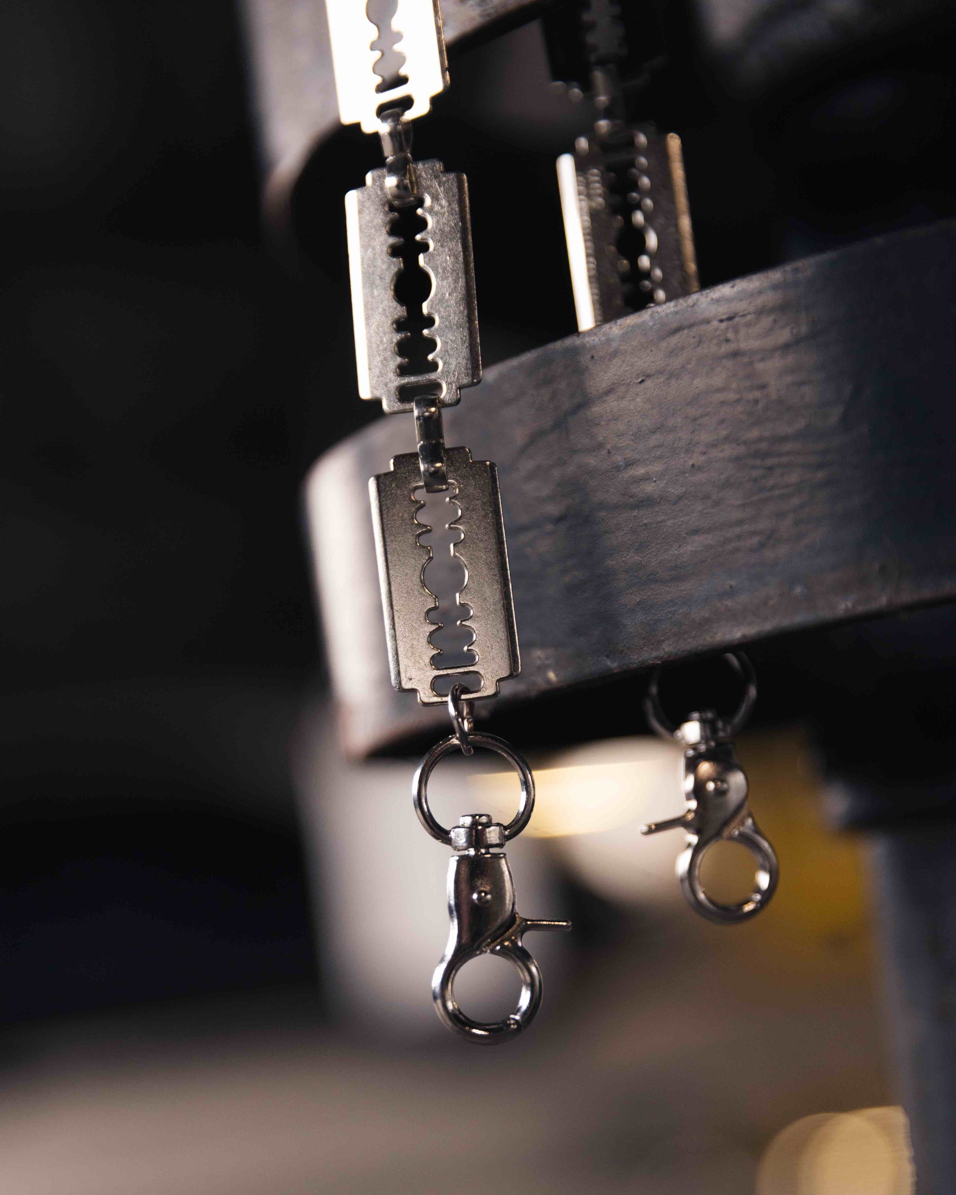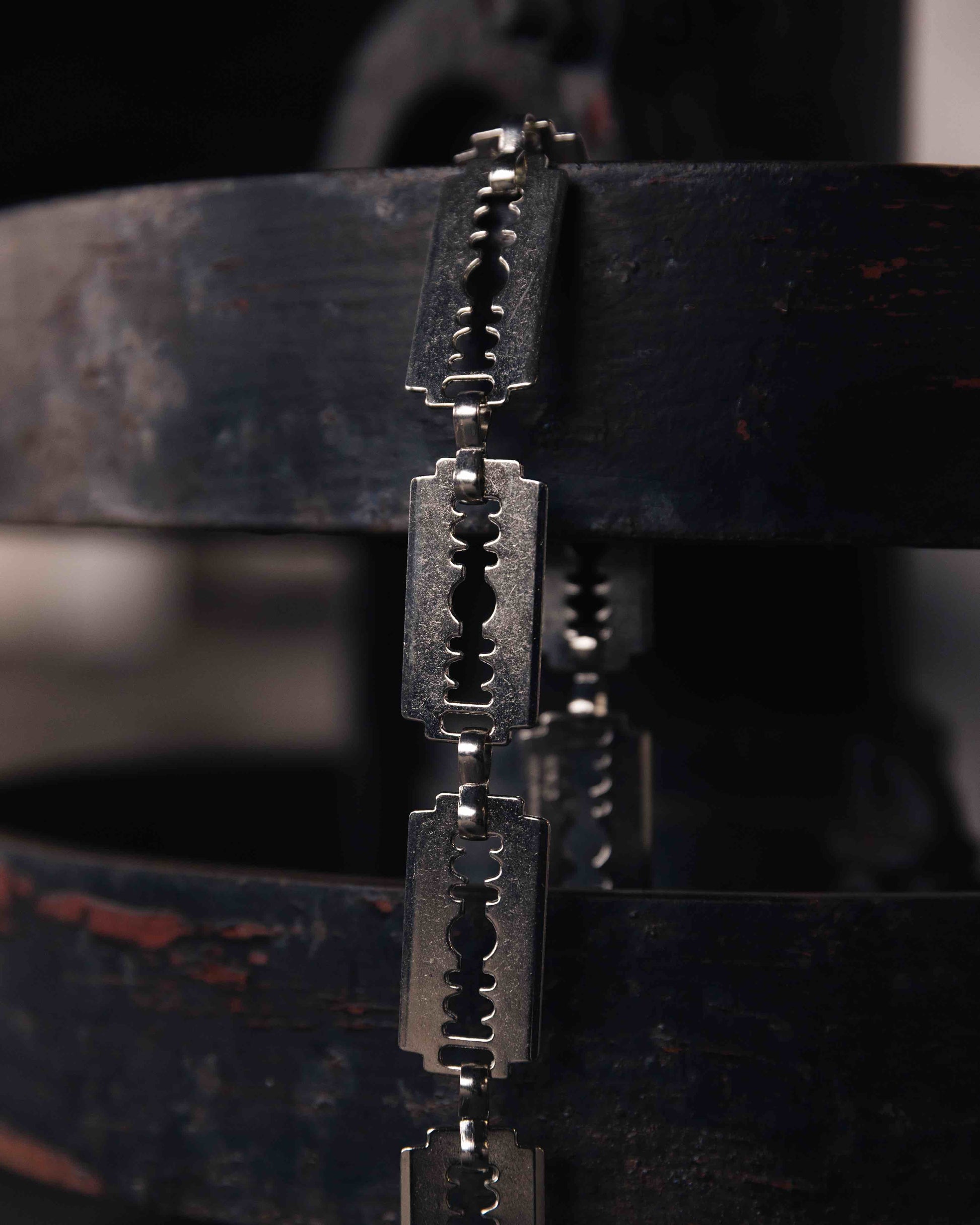 Statement chain featuring razorblade detailing for a sharp finish. Made from quality metals with a polished surface and secured with a durable lobster clasp for reliable wear.