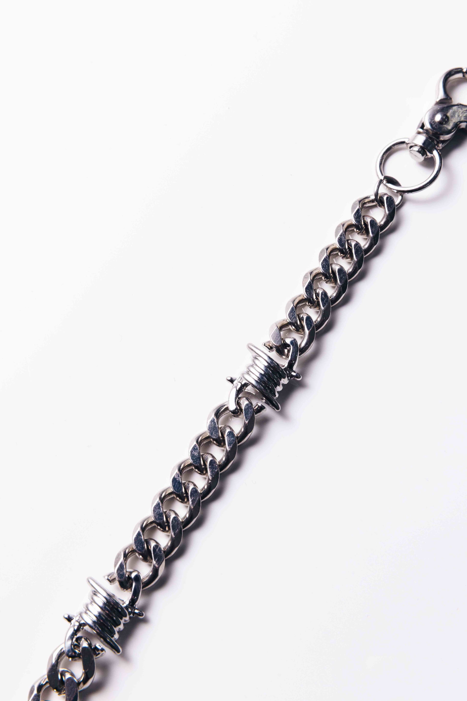 Heavyweight silver curb chain finished with barbed wire detailing for a sharp, industrial look. Made from quality metals with a polished finish and secured with a durable lobster clasp.