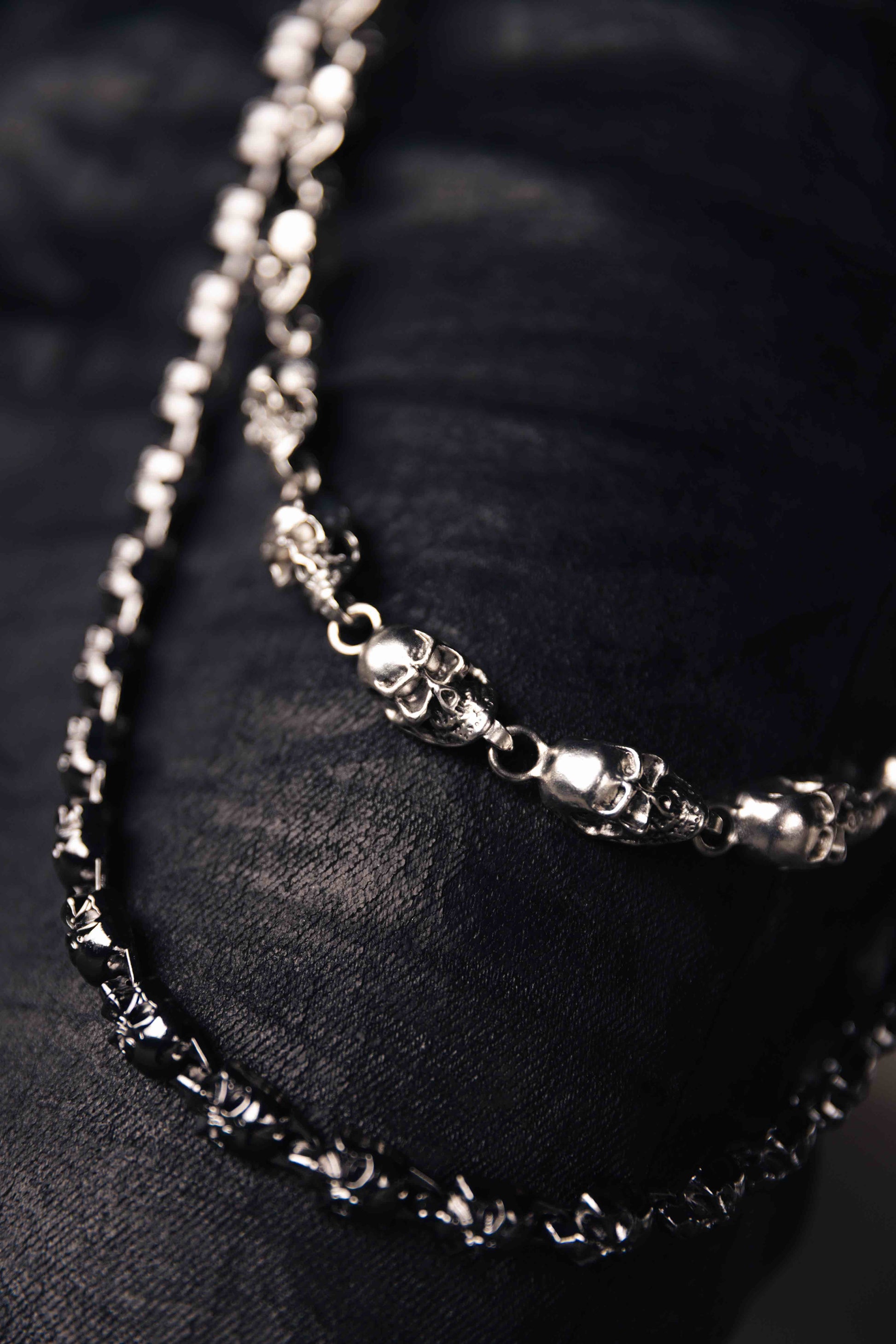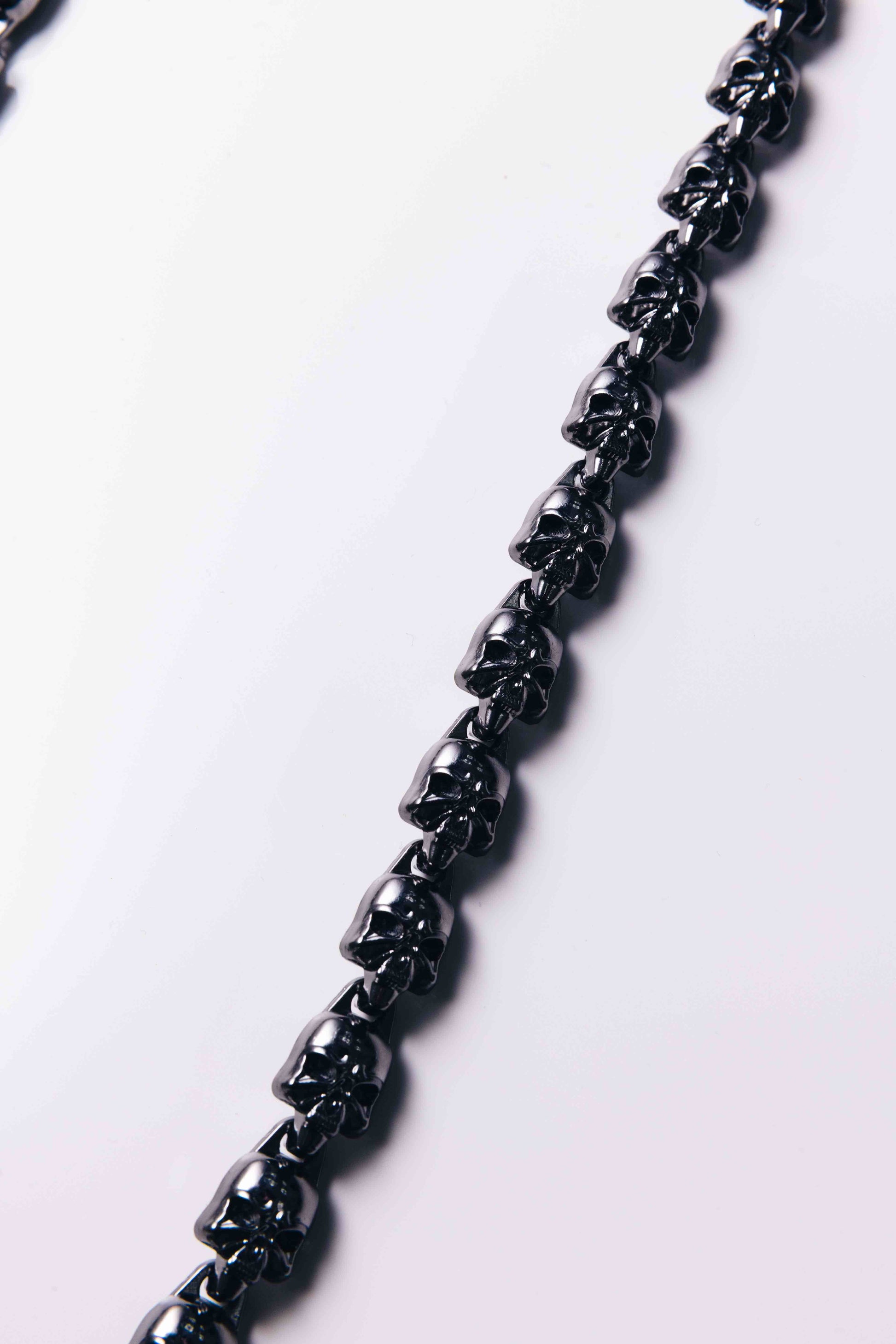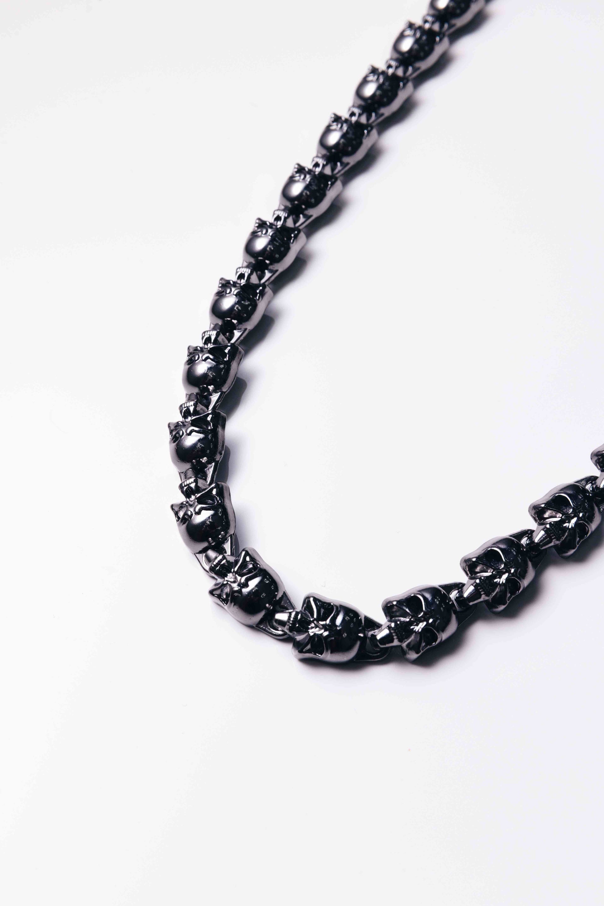 Black skull chain designed with a dark, matte finish for a bold look. Crafted from quality metals and fitted with a durable lobster clasp for secure everyday styling.